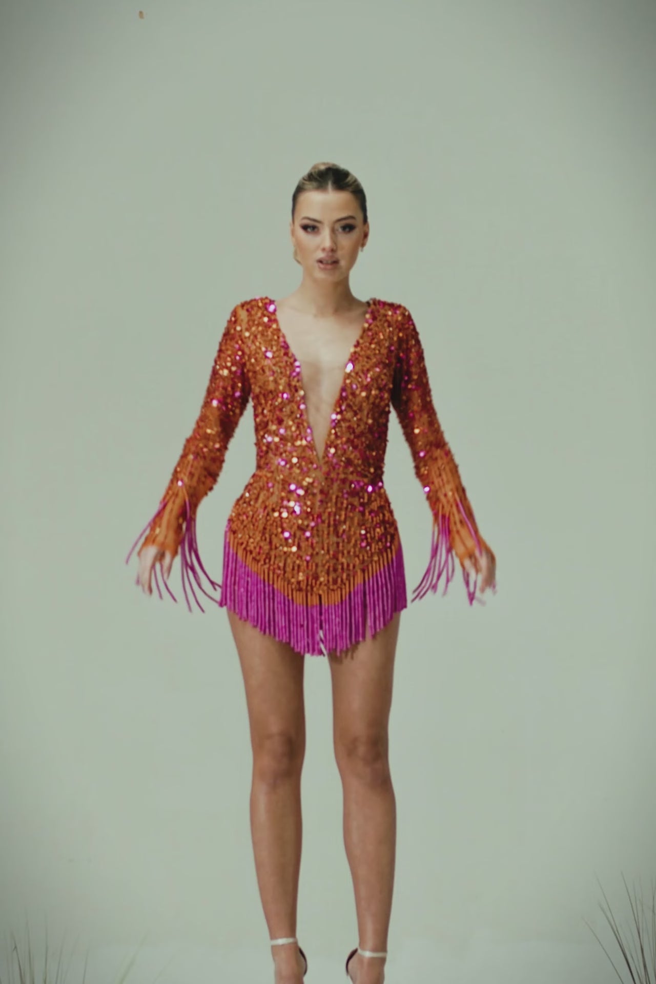 Every inch of this dress is adorned with a mesmerizing array of pink and orange sequins and beads, shimmering and catching the light with every movement. The striking contrast between the two hues creates an electrifying effect, symbolizing confidence and strength.