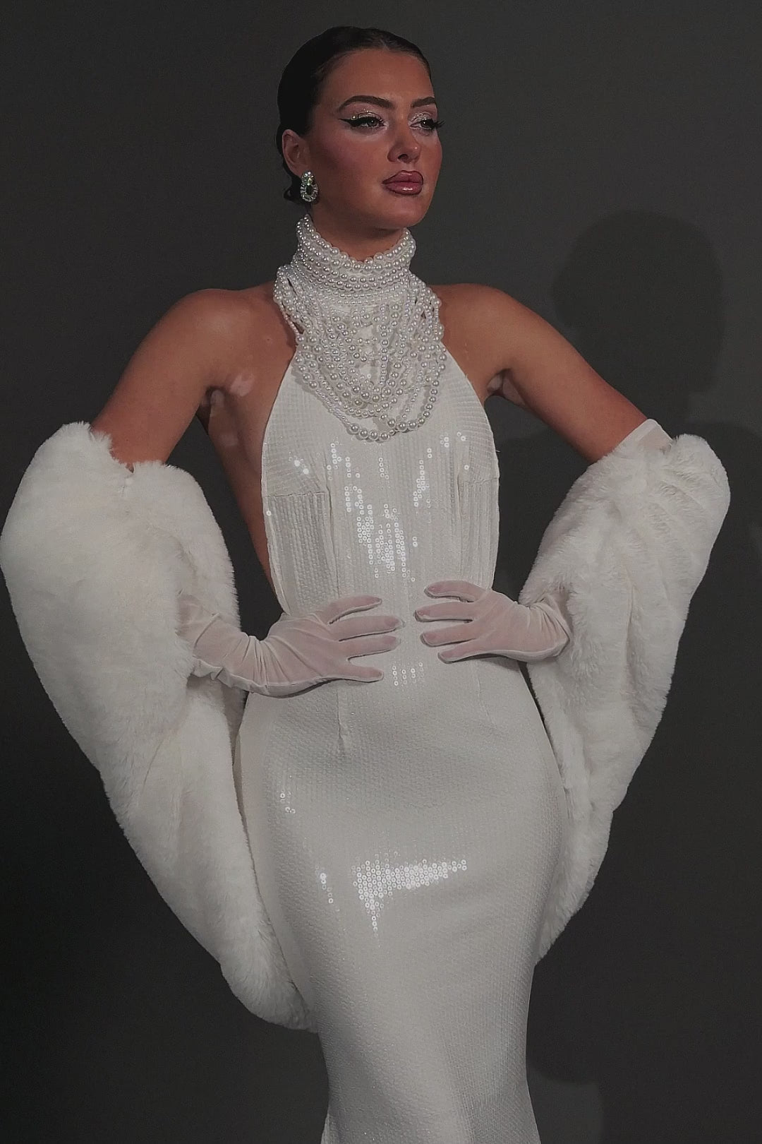 The high neckline is adorned with cascading pearl embellishments, creating a striking statement collar that drapes gracefully across the décolletage. A daring open back adds contrast and allure, while the fitted bodice flows into a floor-length hem finished with plush faux-fur trim for a luxurious, couture-inspired touch.