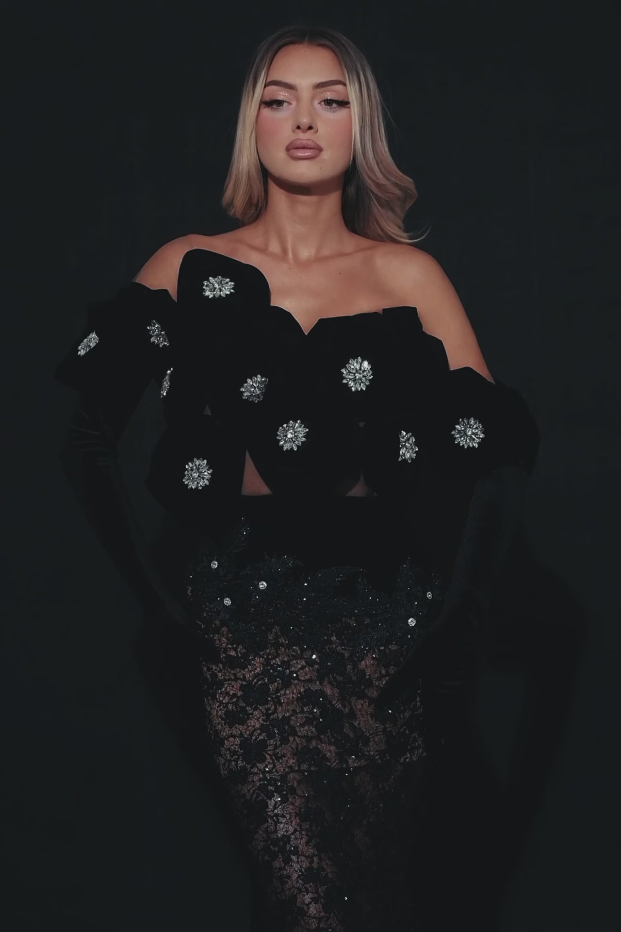The lower part of the dress is a mermaid silhouette, made from detailed black lace that flows gracefully to the floor. It's adorned with delicate hooks that add allure and create a captivating contrast.