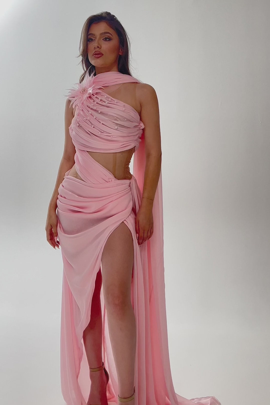 The top wraps asymmetrically around the body with pearl accents and a delicate feathered floral detail at the shoulder, adding both structure and softness.
