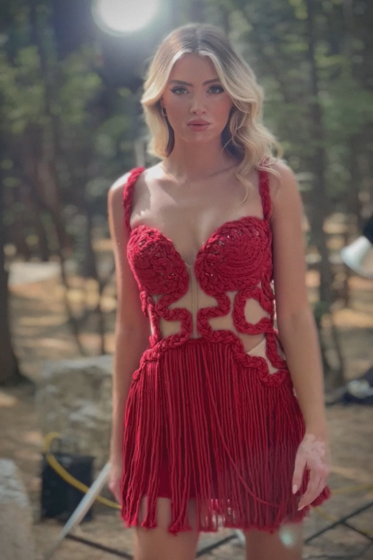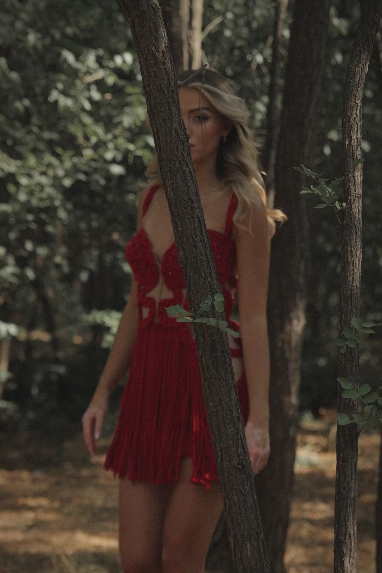 This exclusive red short dress is a bold and intricate design, inspired by the art of tapestry. The top part features a macrame bodice, with braids forming a unique, textured pattern.