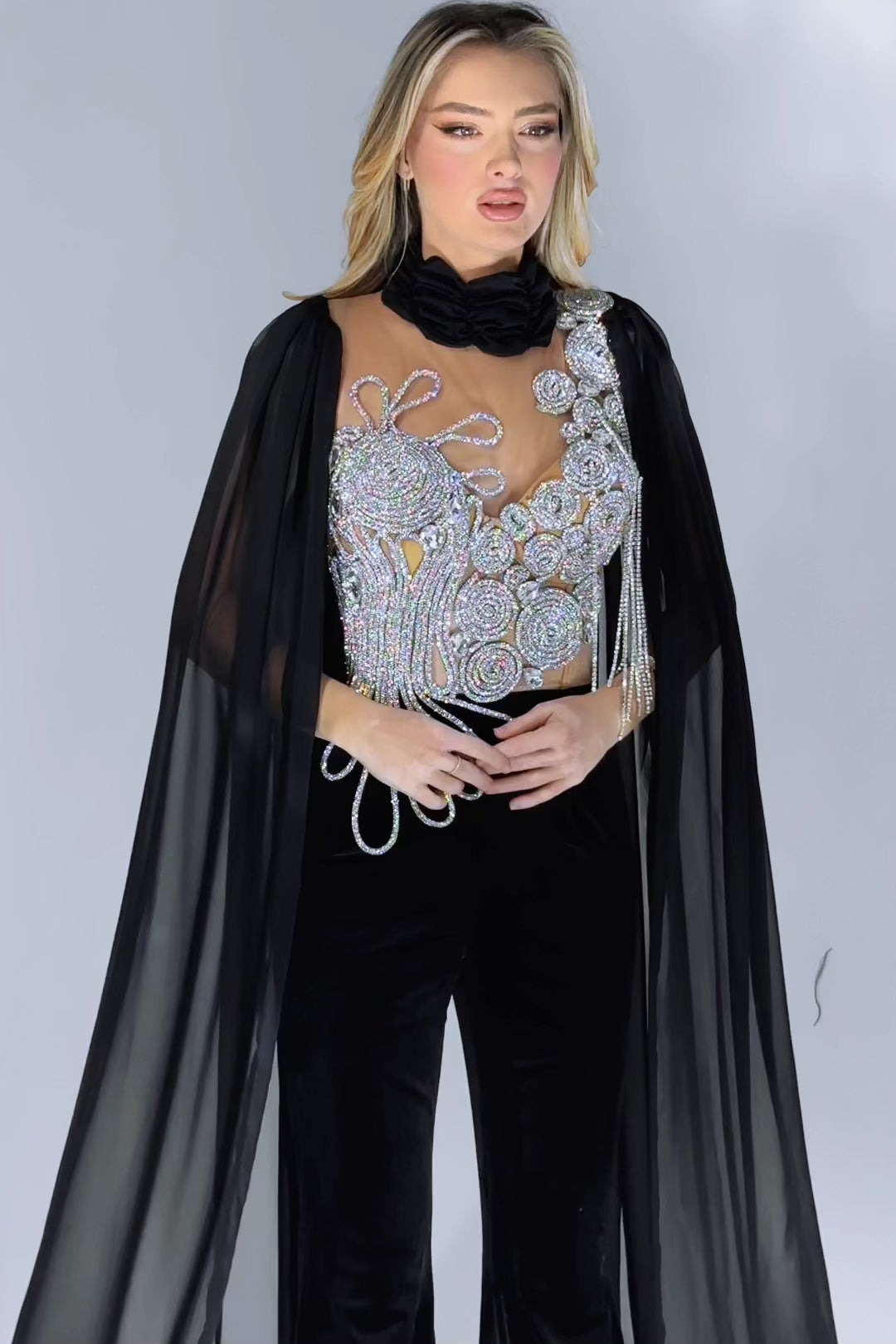 The accented with scintillating silver details of the design allows the beauty of the jumpsuit's craftsmanship to shine through, highlighting the attention to detail and quality of the handmade construction. The sleek and fitted silhouette is complemented by a range of features that add to the overall sophistication of the design.