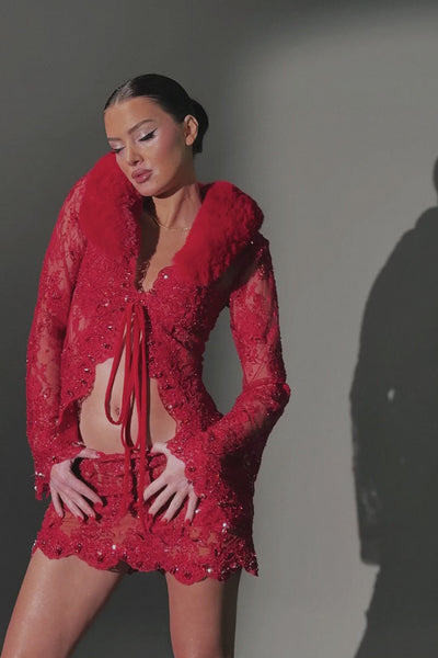 A striking fusion of sensual elegance and modern glamour, this red lace two-piece set is designed to make a statement. Crafted from intricate floral lace with delicate embellishment throughout, the fitted silhouette highlights the body while maintaining a refined, couture feel.
