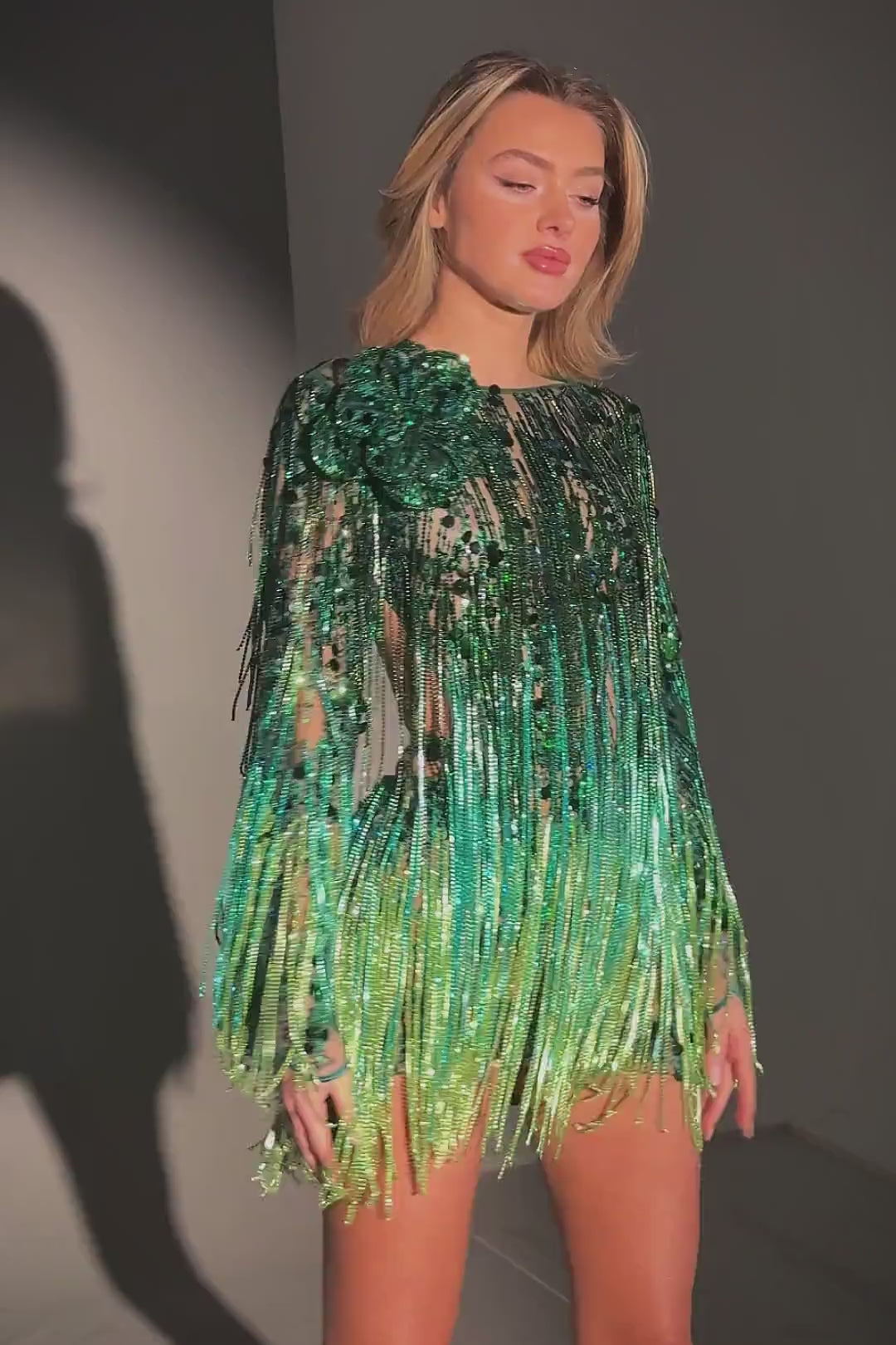 This dress is all about fun, movement, and glamour! The shimmering green sequins and beaded fringe give it a dynamic energy, catching the light beautifully as you move.