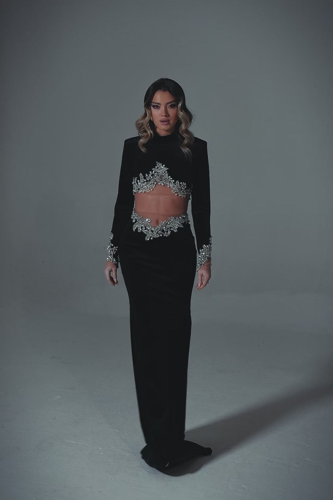 Elevate your style with our black two-piece outfit that effortlessly blends sophistication and allure. The short upper part boasts long sleeves with silver details across the chest, adding a touch of celestial charm.