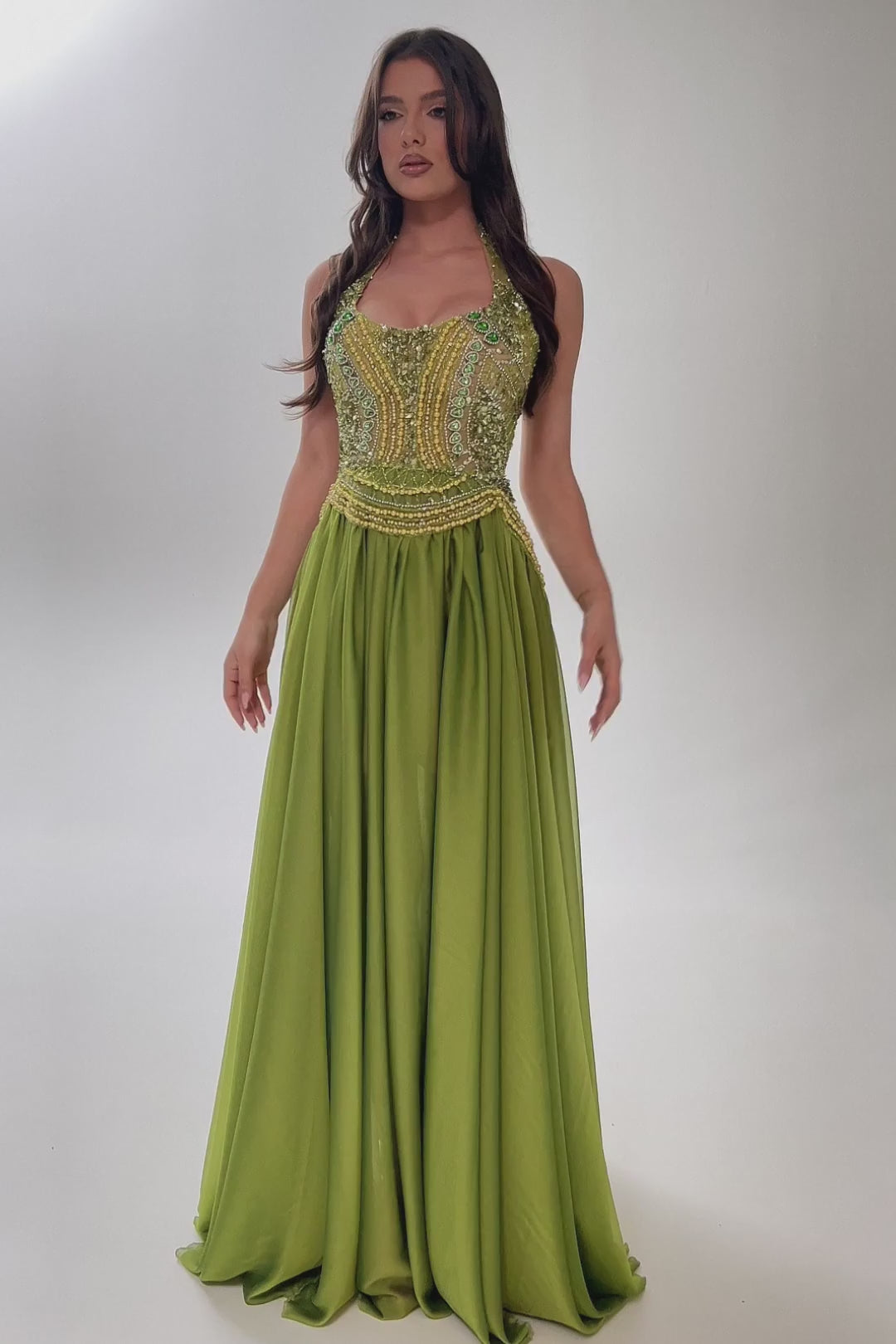 This structured, corset-style top gently melts into a flowing chiffon skirt in a rich olive green, echoing the soft movement of leaves in the breeze.