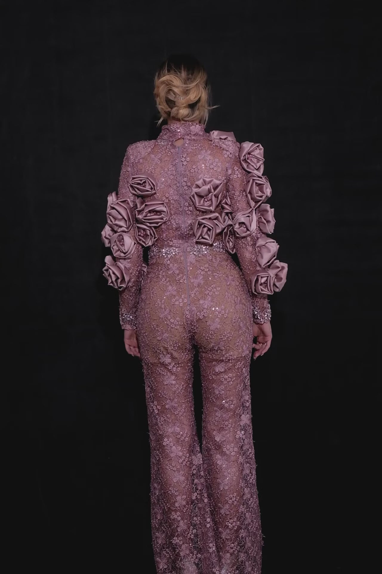 Meet our charming lace jumpsuit, a perfect blend of elegance and playfulness. The upper part of this jumpsuit is adorned with lovely flowers and intricate details, creating a beautiful and stylish look.