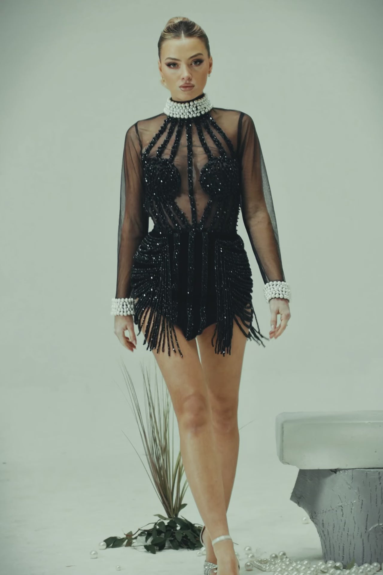 Elevate your style with this captivating black short dress adorned with glistening black crystal beads. The allure of this dress is enhanced by its long tulle transparent sleeves, adding an ethereal touch to the ensemble.
