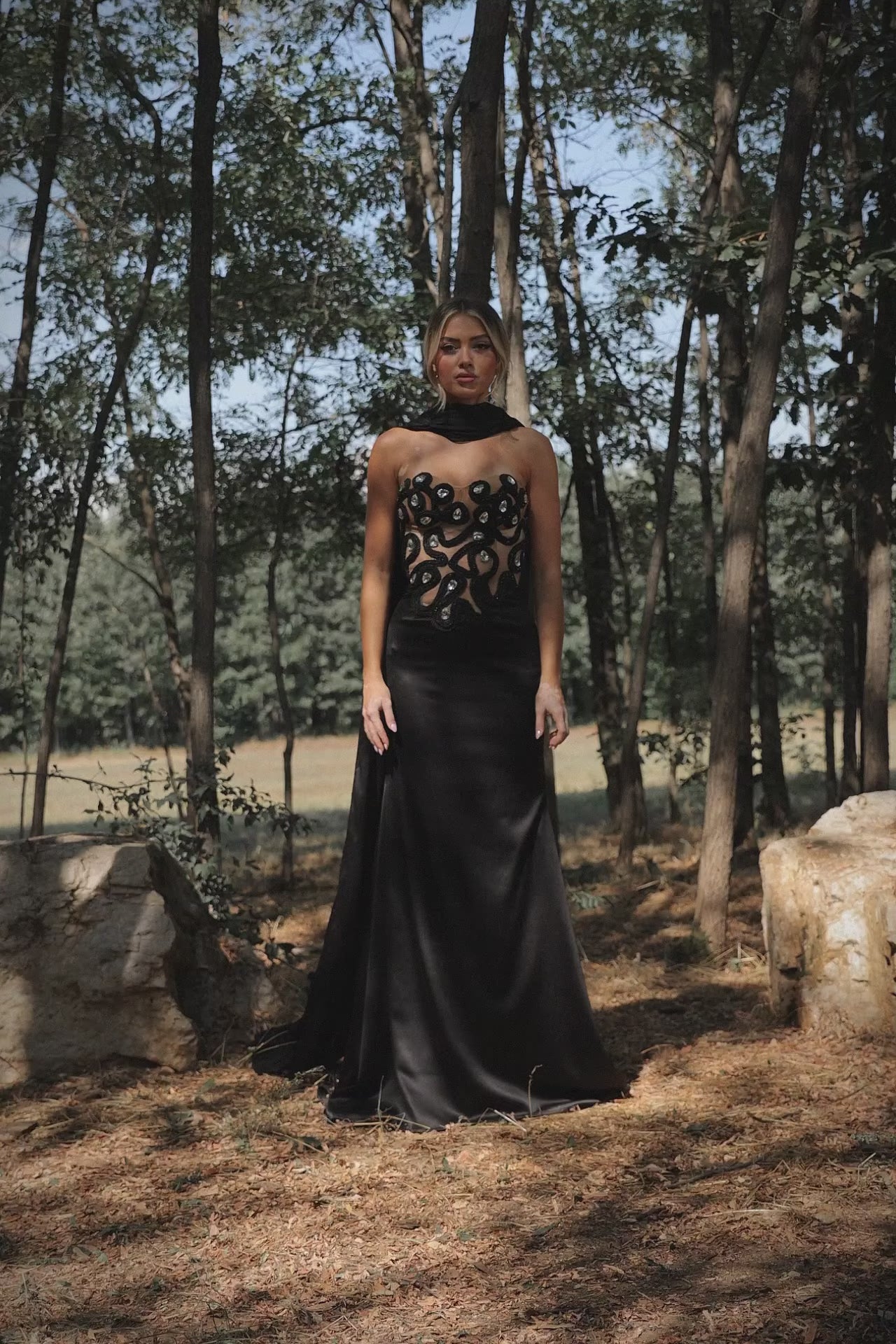 This detailed work gives the bodice a rich, textured feel, reminiscent of fine tapestry. The bottom part flows into a sleek satin silk skirt in a mermaid shape, hugging the body before flaring out gracefully.