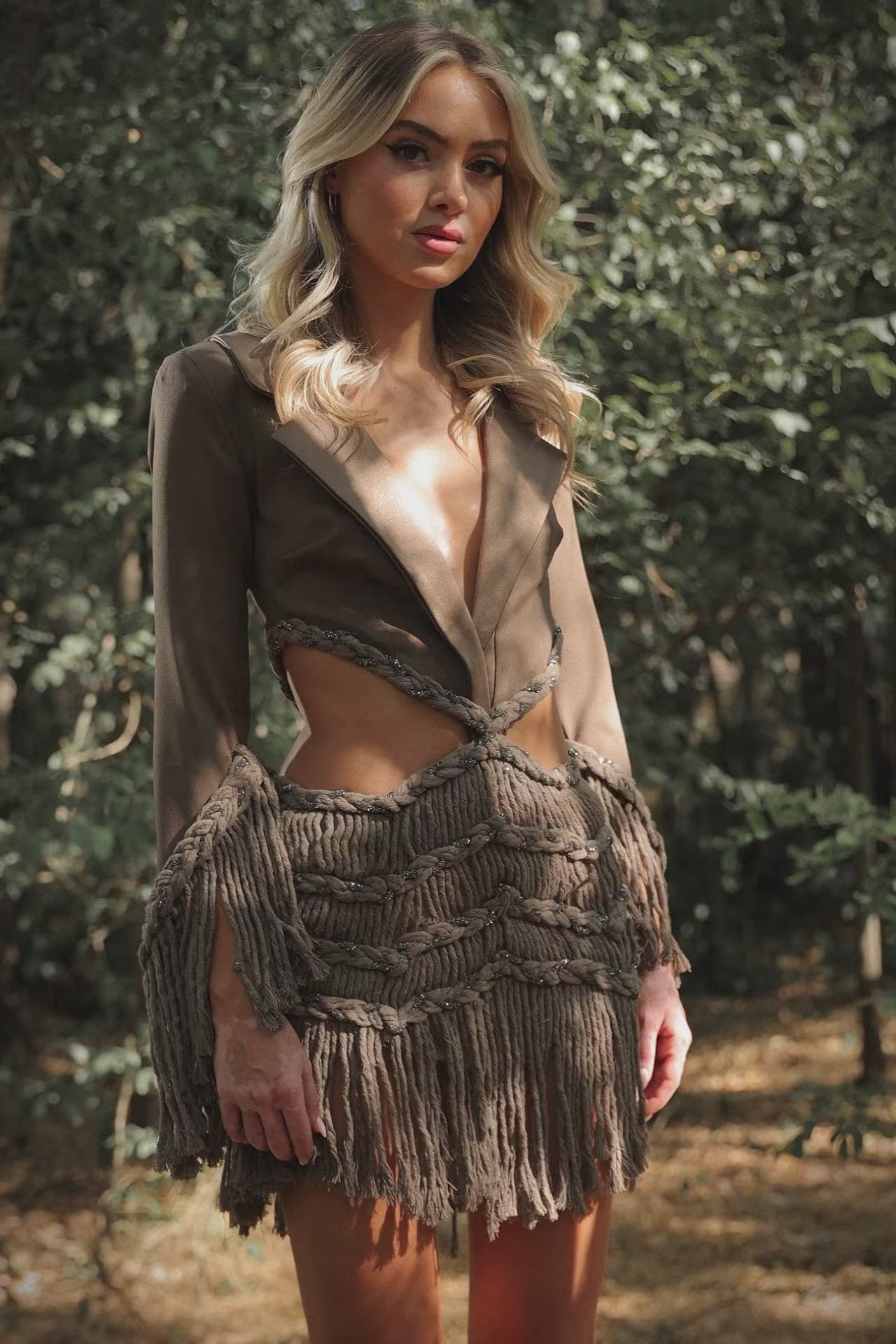 The sleeves are finished with delicate macrame details, adding a touch of texture and craftsmanship. The bottom part of the dress is crafted entirely from macrame, woven into different shapes that create a unique and eye-catching pattern.