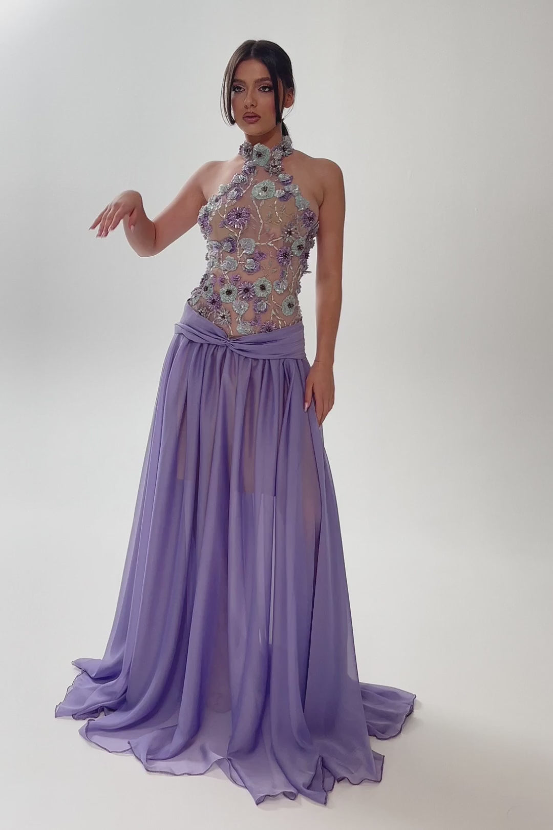 The waist is cinched with a draped lavender sash that flows seamlessly into a flowing, floor-length skirt made of sheer, lightweight chiffon. The skirt offers graceful movement and subtle sensuality with its semi-transparent layers, making it perfect for a glamorous evening or red carpet event.
