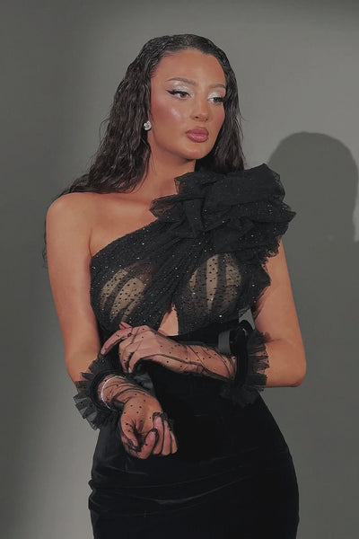 An elegant expression of modern couture, the Nocté Gown is designed to captivate with refined drama and timeless sophistication. Crafted in smooth black velvet, this one-shoulder gown sculpts the figure with a sleek, elongated silhouette that feels both powerful and feminine.