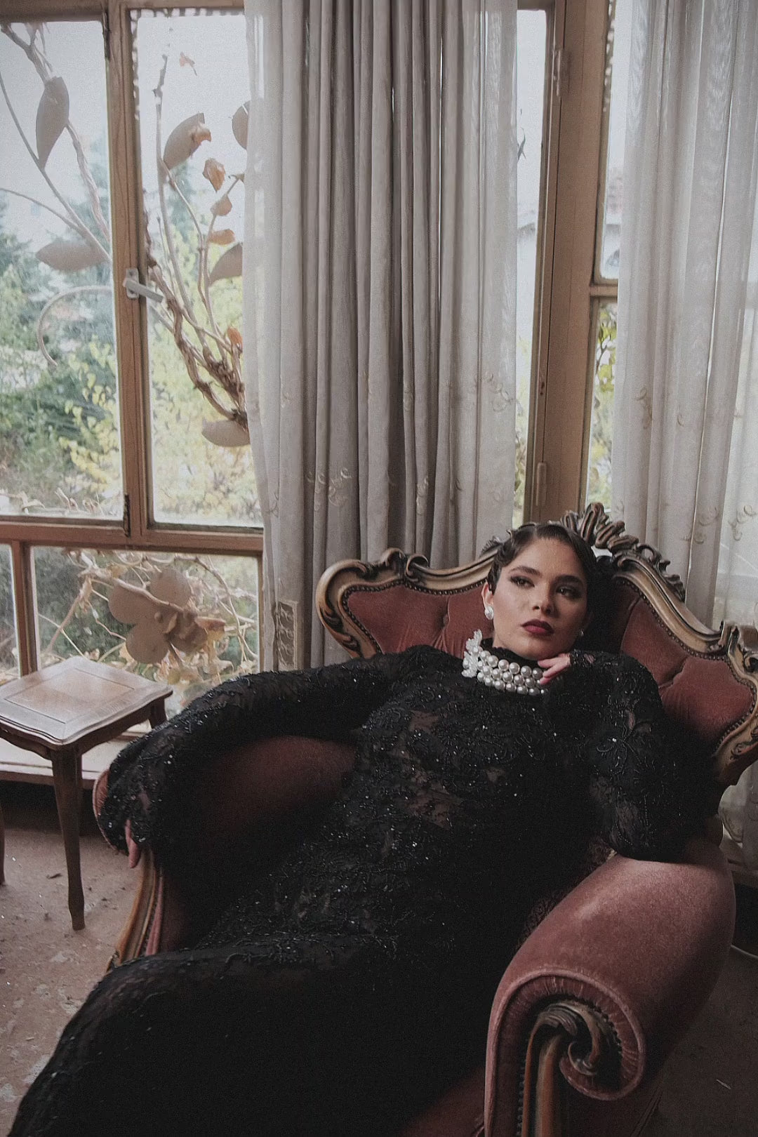 This black lace dress is a stunning blend of elegance and craftsmanship. Made entirely from handmade lace, it features a high neckline and long sleeves for a classic, refined look.