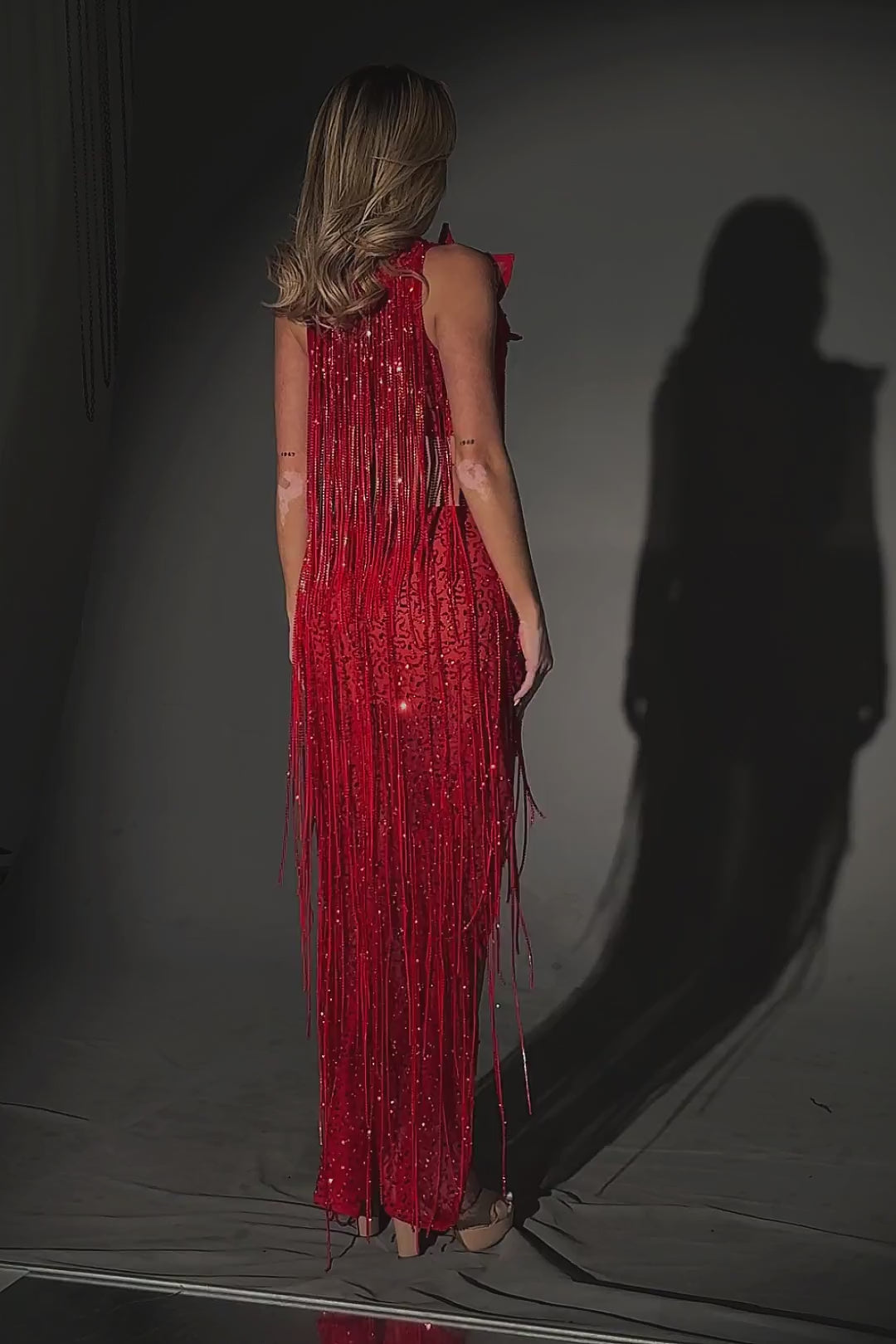 This two-piece red dress is bold, glamorous, and full of energy. The top has a high neckline with a unique, asymmetrical design, and the standout feature is a large, dramatic flower sitting on one shoulder. It’s detailed, sparkly, and adds a touch of elegance while making a big statement. Long fringes hang down from the top, swaying beautifully as you move and catching the light in the most stunning way.