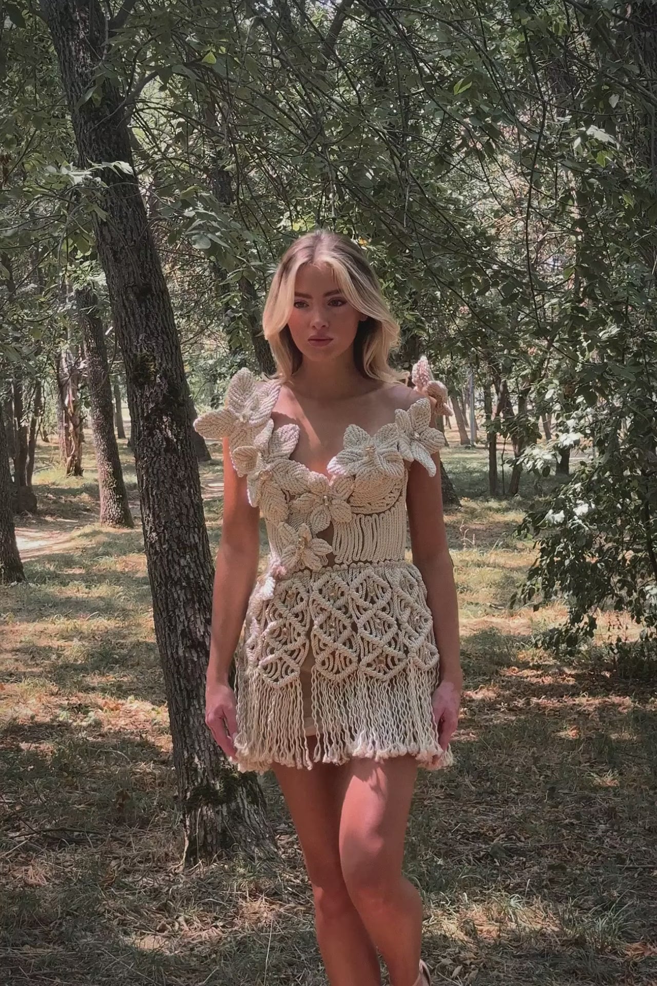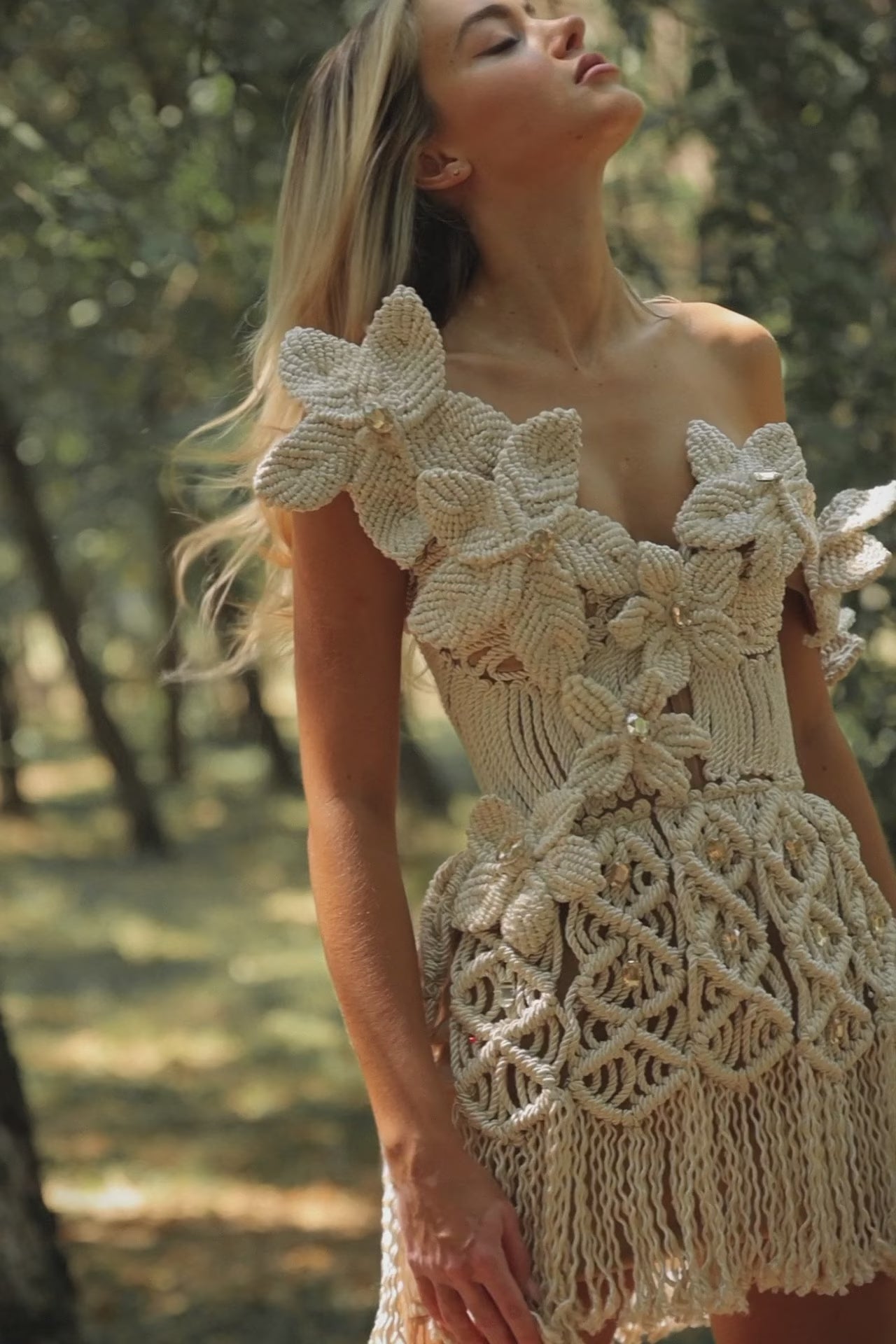 The dress transitions into a skirt made of elaborate macrame patterns, reminiscent of traditional tapestry weaves, with a fringe hem that sways with every movement.