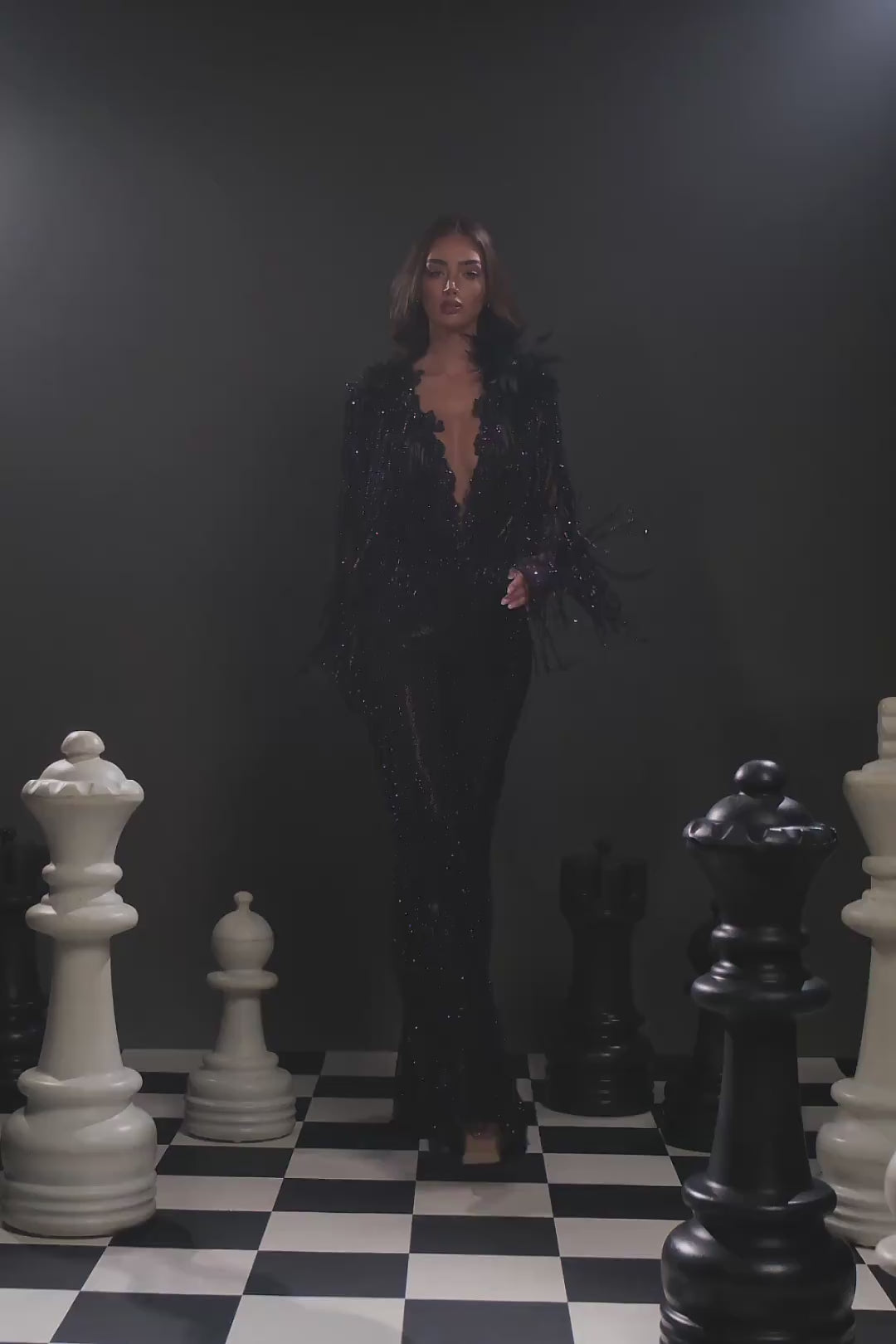 Fierce. Fearless. Unforgettable. The Midnight Inferno jumpsuit brings bold sophistication to the forefront with its deep plunging neckline and crystal embellishments that shimmer with every move.