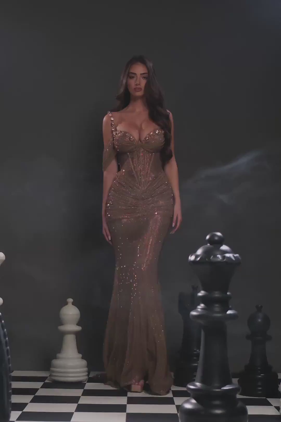 Crafted in shimmering metallic gold, this design features a sculpted bodice with intricate draping that accentuates the waist and hips.