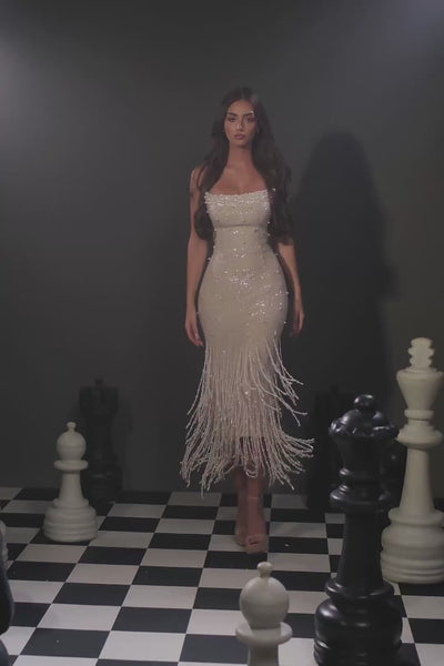 The delicate beaded fringe hem adds graceful motion, creating a timeless yet fashion-forward look. Designed for the woman who embodies sophistication, confidence, and effortless allure.