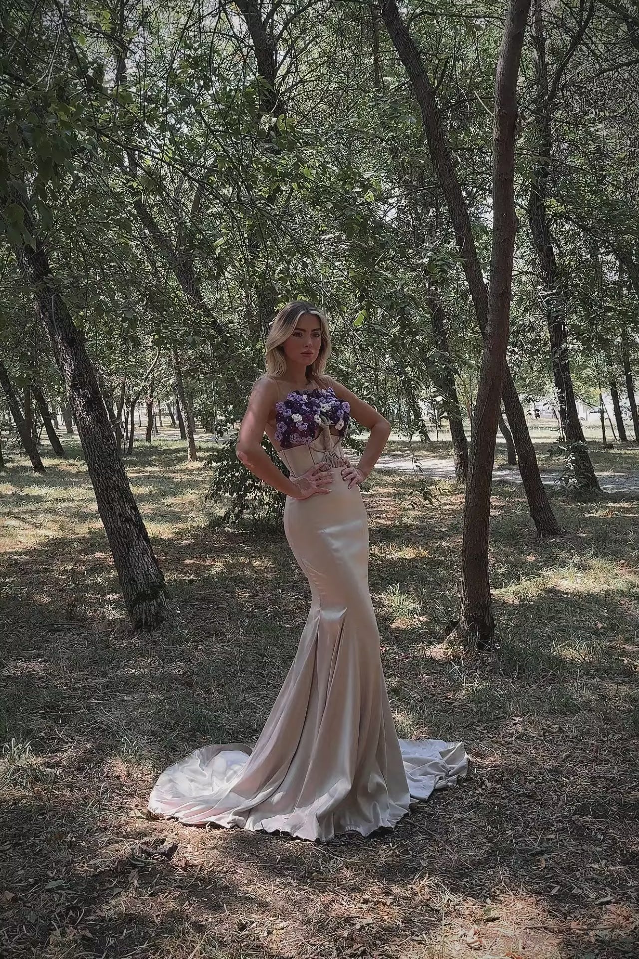 This stunning gown features a sleek, form-fitting silhouette that flares into a mermaid-style skirt, crafted from luxurious champagne satin.