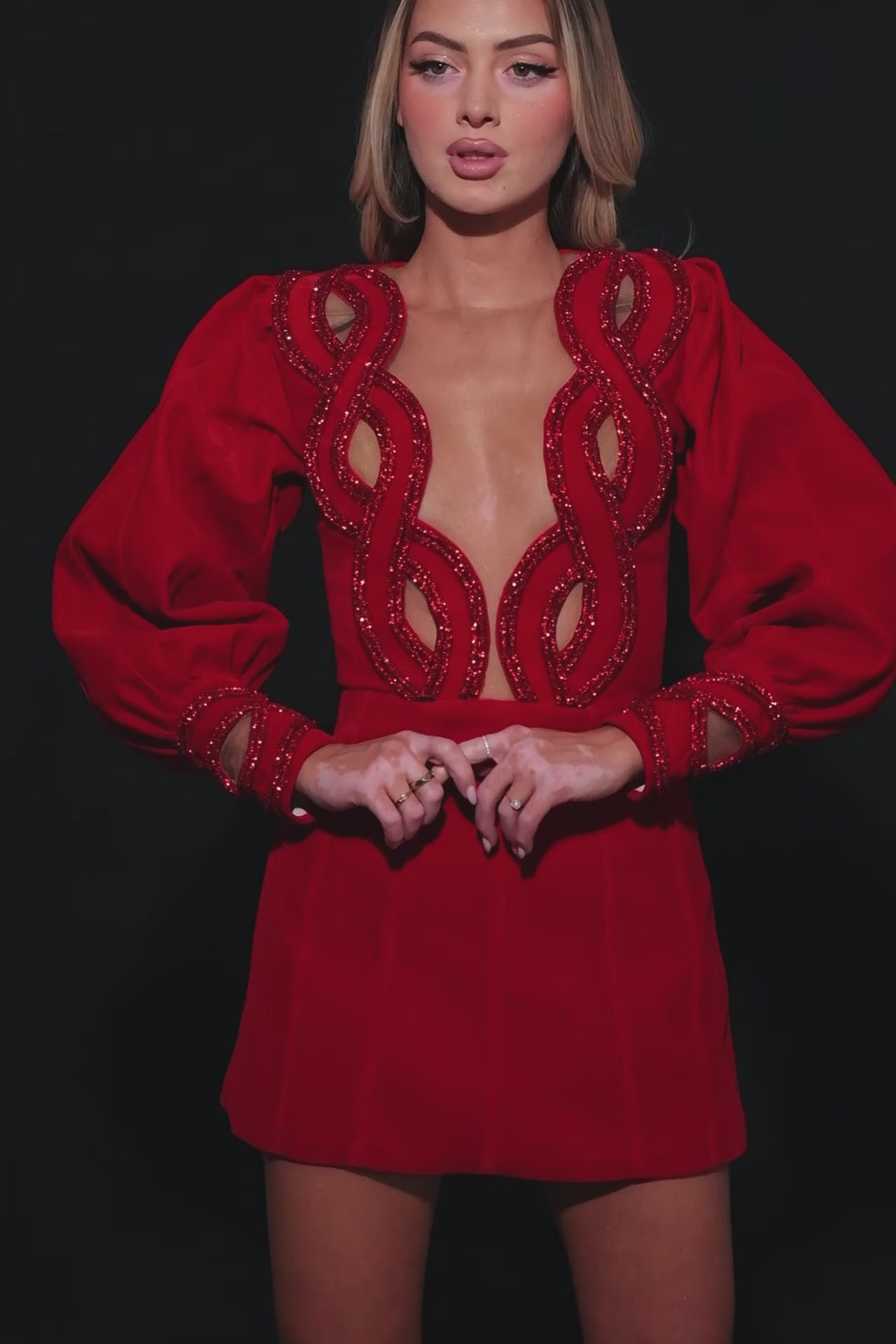 Behold a captivating short red dress with a unique and alluring cut. This dress is designed to make you stand out in style.