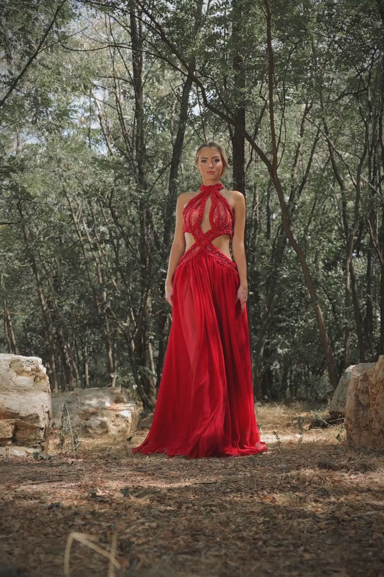 This exclusive red dress is a masterpiece of design, seamlessly blending the intricate artistry of macrame with the luxurious flow of silk.
